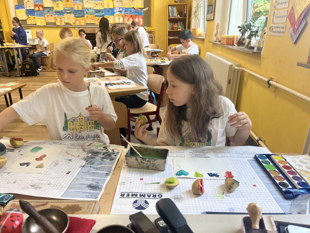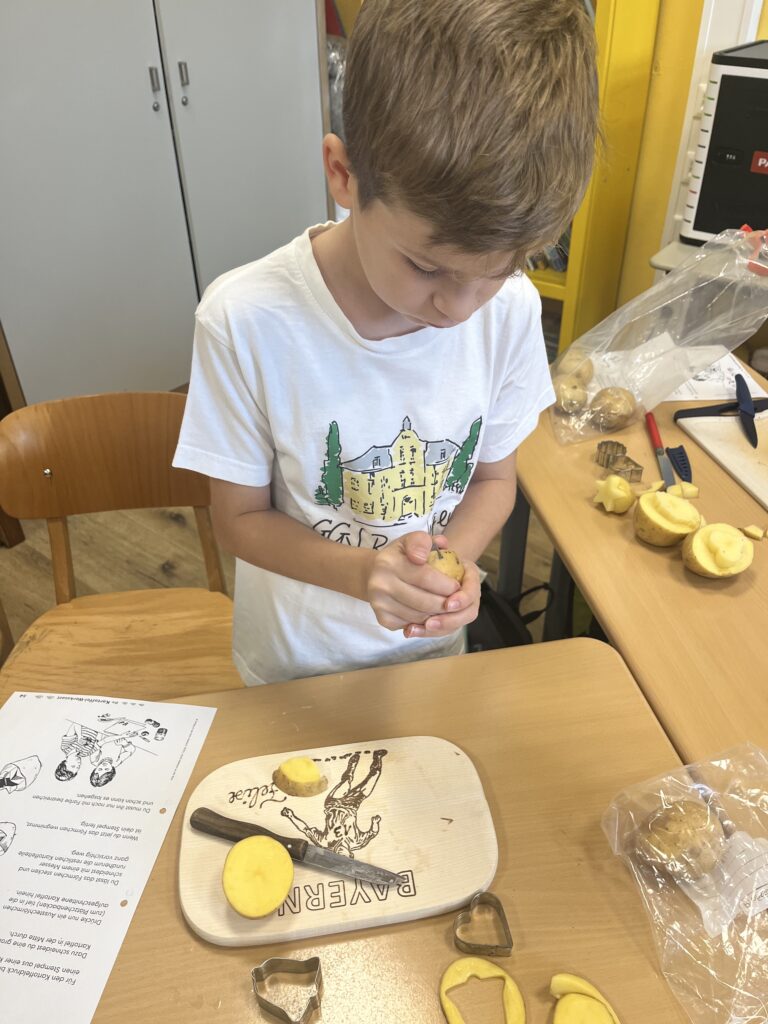 Die Igelkinder der 3b lernten zum "Kartoffelthema" in Kunst den Kartoffeldruck kennen. Sie erstellten eigene Stempel aus Kartoffeln und nutzen diese mit ihren Wasserfarben.